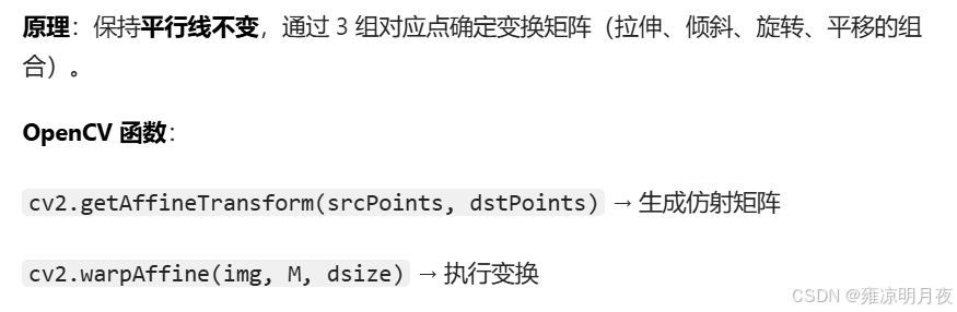 图像几何变换中,图像的几何变换中的resize,平移,旋转常用于图像数据增强,仿射和透视不用来数据增强,后者情况不明显。