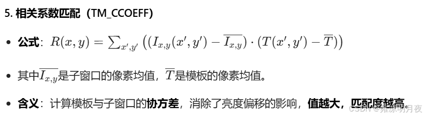 image:原始图像(灰度图或彩色图,推荐灰度图)。templ:模板图像(需与原始图像通道数一致,尺寸更小)。method:匹配方法(如cv2.TM_CCOEFF_NORMED、cv2.TM_SQDIFF_NORMED)。