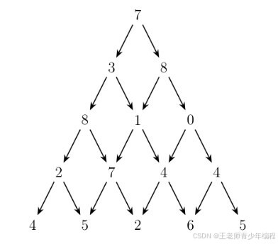 数字三角形最大路径和问题,即在给定的三角形数字阵列中,找到从顶部到底部路径的最大累加值,路径每一步只能从当前点移动到下一行相邻点。 - 算法思路