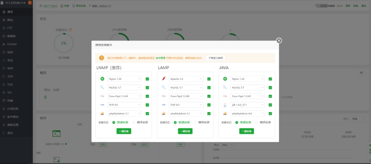 进入面板后,会提示安装基础环境,推荐选择LNMP,也可以跳过此步骤后期在软件商店中自行安装