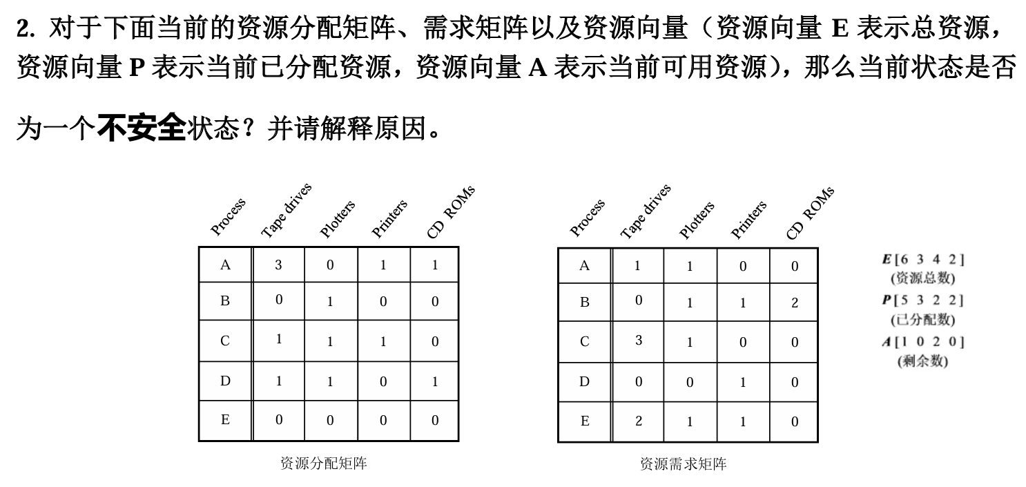 | e.g.银行家算法, 安全or不安全 | e.g.资源分配图 |