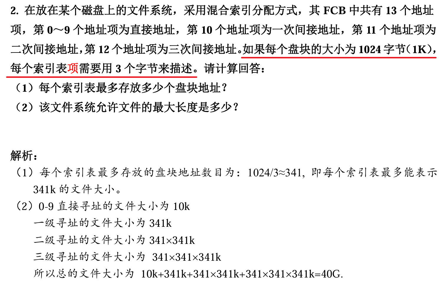 索引表 本身占用一个大小为1024字节的盘块, 每个索引表项 (一个盘块地址)占用3字节。