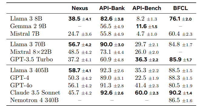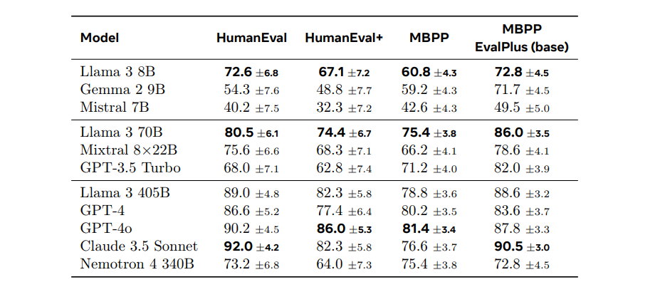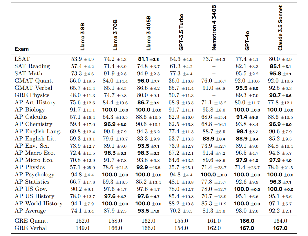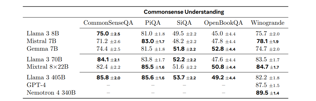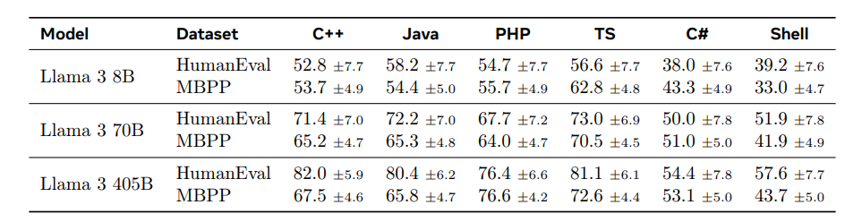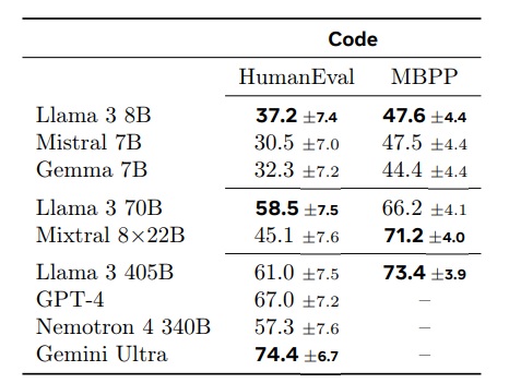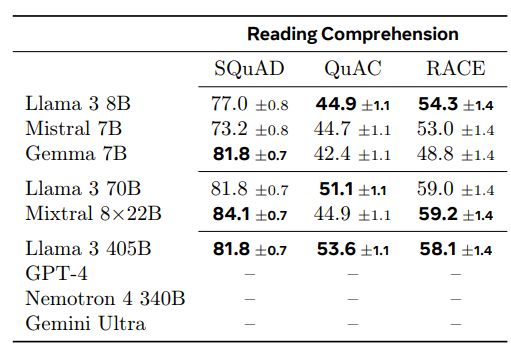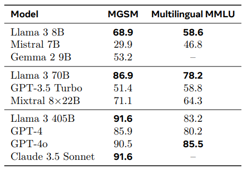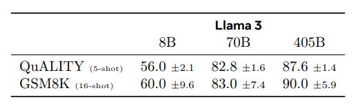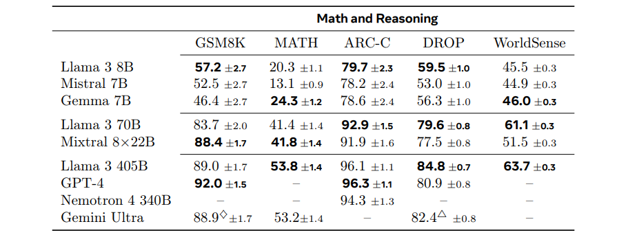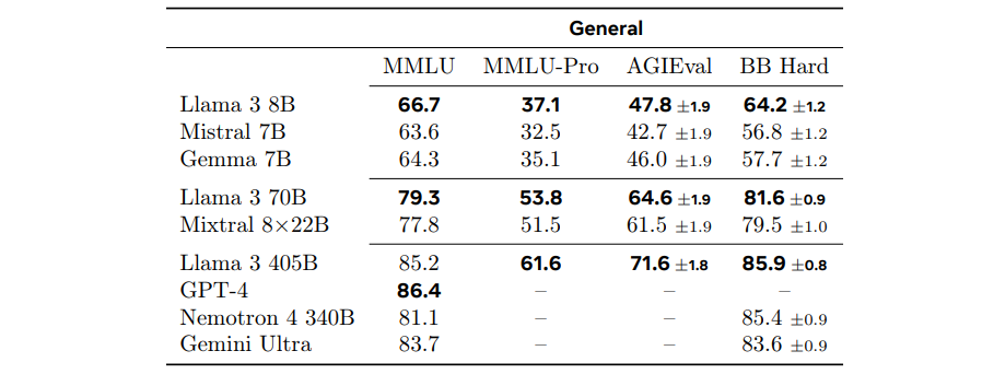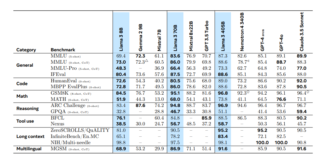 表 2 微调后的 Lama3 模型在关键基准测试中的表现。该表比较了 Llama3的 8B、70B 和4058 版本与竟争模型的性能。我们用粗体标出了三个模型规模等效类别中性能最佳的模型。使用5次提示(无CoT)获得的结果。不使用CoT获得的结果。使用零次提示获得的结果。