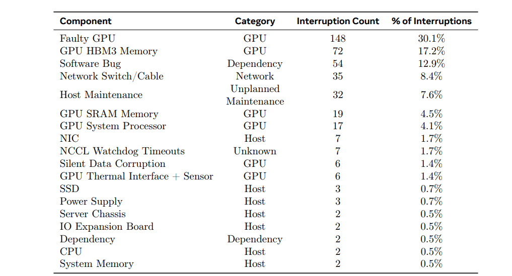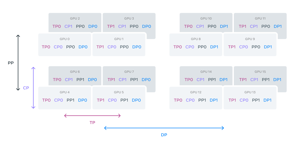 计算(Compute)。Llama 3 405B 在最多 16K 张 H100 GPU 上训练,每张 GPU 运行在 700W TDP,配备 80GB HBM3,使用 Meta 的 Grand Teton AI 服务器平台(Matt Bowman, 2022)。每台服务器包含八张 GPU 和两颗 CPU。在服务器内部,八张 GPU 通过 NVLink 互联。训练任务通过 Meta 的全球规模训练调度器 MAST(Choudhury et al., 2024)进行调度。