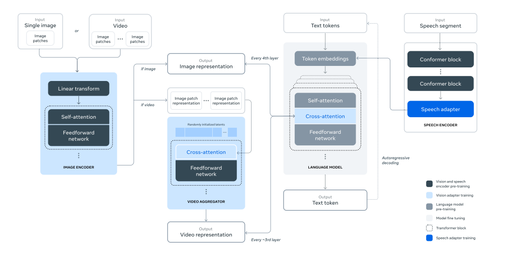 • **多模态编码器预训练。**我们为图像和语音训练单独的编码器。我们在大量图文对上训练我们的图像编码器,从而让模型学习视觉内容与其自然语言描述之间的关系。我们的语音编码器使用自监督方法进行训练,该方法会遮蔽语音输入的一部分,并尝试通过离散 token 表示重建被遮蔽的部分,从而学习语音信号的结构。图像编码器的细节见第 7 节,语音编码器的细节见第 8 节。