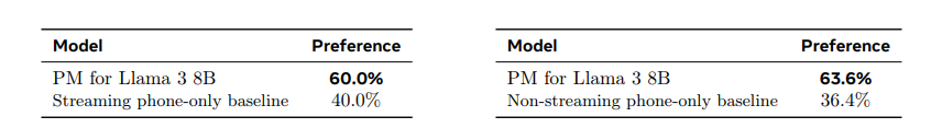 表35韵律建模(PM)评估。左侧:评估者对Llama 3 8B PM与纯音素流式核心模型的偏好。右侧:评估者对Llama 3 8B PM与非流式纯音素流式核心模型的偏好。