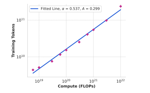 我们利用图 2 的数据对 A 和 α 进行拟合,得到 (α, A) = (0.53, 0.29);相应拟合结果如图 3 所示。将该 scaling law 外推到 3.8 × 10²⁵ FLOPs 时,结果表明应在 16.55T 个 token 上训练一个 402B 参数的模型。