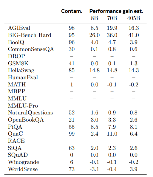 遵循 OpenAI (2023a),我们评估了在退火过程中加入 GSM8k (Cobbe et al., 2021) 和 MATH (Hendrycks et al., 2021b) 训练集的有效性。我们发现,退火让一个预训练的 Llama 3 8B 模型在 GSM8k 和 MATH 验证集上的性能分别提升了 24.0% 和 6.4%。然而,对 405B 模型的提升可以忽略不计,表明我们的旗舰模型具有强大的上下文学习和推理能力,并不需要特定领域数据来获得强性能。
