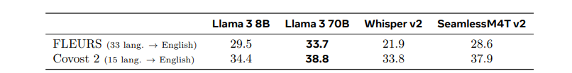 表 32 Llama 3 的语音接口在语音翻译任务上的 BLEU 分数。我们报告了 Whisper 和 SeamlessM4T 的性能以提供参考。