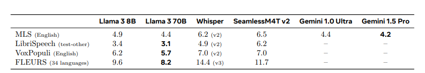 表 31 Llama 3 的语音接口在语音识别任务上的词错误率。我们报告了 Whisper、SeamlessM4T 和 Gemini 的性能以提供参考。