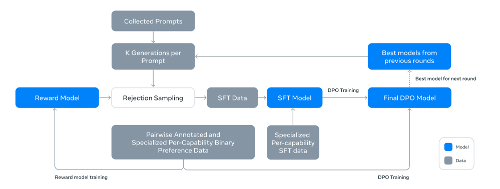 3 后训练 【SFT + 多阶段 RL 对齐】: 在预训练之后,LLaMA 3 采用了复杂的多阶段对齐流水线 ,融合了监督微调(SFT)、拒绝采样(Rejection Sampling) 、PPO (Proximal Policy Optimization)和 DPO(Direct Preference Optimization)等多种强化学习和偏好优化技术。通过多阶段协同,显著提升了模型在人类偏好、安全性、长文本生成和指令遵循等方面的表现。