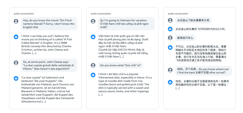 图30 使用Llama 3的语音接口重构的对话示例。这些示例展示了零样本多轮对话和代码切换能力。
