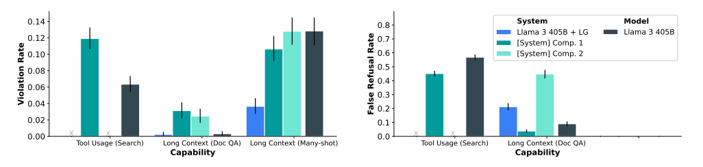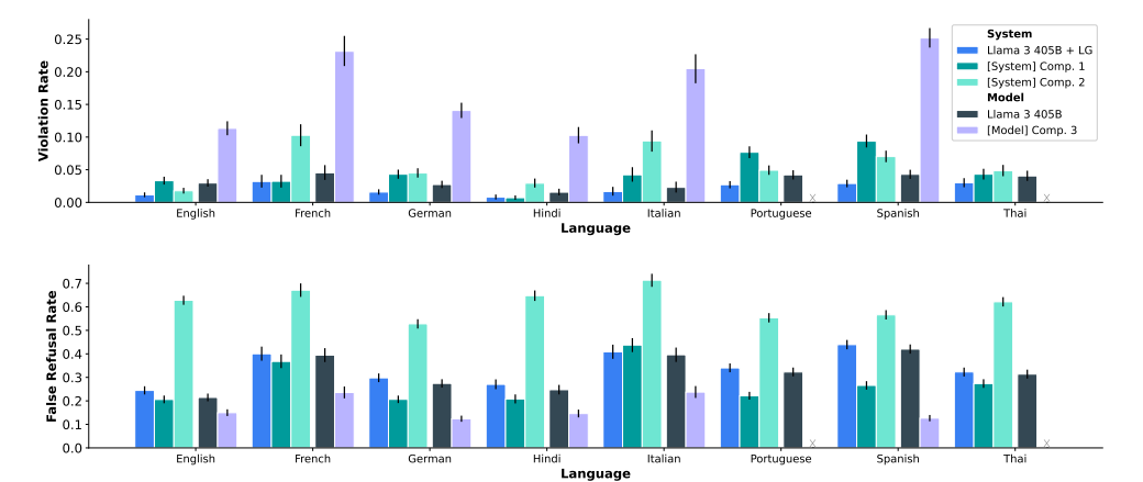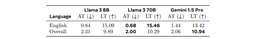 安全性。我们在 MuTox(Costa-jussà et al., 2023)数据集上评估语音模型的安全性。MuTox 是一个包含 20,000 条英语与西班牙语语音、以及 19 种其他语言各 4,000 条的多语言音频数据集,每条均带有毒性标签。模型接受音频输入,输出结果在去除部分特殊字符后由 MuTox 分类器评估,并与 Gemini 1.5 Pro 对比。我们评估两项指标:新增毒性百分比(AT)------输入安全但输出有毒;丢失毒性百分比(LT)------输入有毒但输出安全。表 33 展示了英语和我们评估的 21 种语言平均结果。²² 新增毒性百分比非常低:我们的语音模型在英语上的新增毒性最低,不到 1%。模型移除的毒性显著多于新增的毒性。