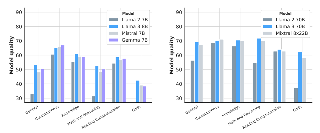 Llama 3 使用标准的、密集的 Transformer 架构(Vaswani et al., 2017)。在模型架构方面,它与 Llama 和 Llama 2(Touvron et al., 2023a, 2023b)并没有显著偏离;我们的性能提升主要来自数据质量与多样性的改进,以及训练规模的扩大。