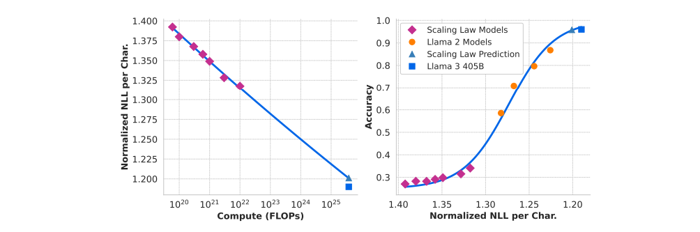 图 4 ARC Challenge 的标度律预测。左图:ARCChallenge 基准测试中正确答案的归一化负对数似然值与预训练 FLOPs的函数关系。右图:ARCChallenge 基准测试准确率与正确答案的归一化负对数似然值的函数关系。此分析使我们能够在预训练开始前预测模型在 ARC Challenge 基准测试上的性能。详情请参见正文。