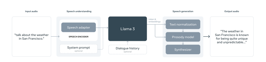 我们进行实验,研究将语音能力以组合方式整合到Llama 3中的方法,类似于我们用于视觉识别的方法。在输入端,一个编码器和一个适配器被结合来处理语音信号。我们利用文本形式的系统提示来实现Llama 3中不同的语音理解模式。如果没有提供系统提示,模型作为一个通用的口语对话模型,能够与Llama 3 文本版本一致的方式有效响应用户的语音。对话历史被引入作为提示,以改善多轮对话体验。我们还尝试使用系统提示,启用 Llama 3 用于自动语音识别(ASR)和自动语音翻译(AST)。Llama 3 的语音接口支持多达 34 种语言。它还允许文本和语音的交错输入,使模型解决能够高级的语音任务理解。