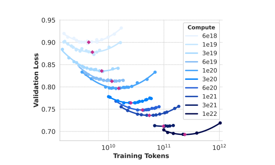 这些实验产生了图 2 中的 IsoFLOPs 曲线。曲线中的损失是在一个独立的验证集上测量得到的。我们使用二次多项式对测得的损失值进行拟合,并识别出每条抛物线的最小值。我们将抛物线的最小值称为对应预训练计算预算下的"计算最优模型(compute-optimal model)"。