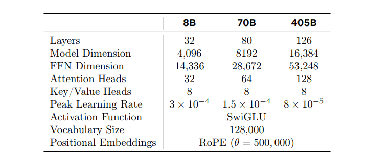 表3 Lama3 关键超参数概述。我们展示了 8B、70B 和 405B 语言模型的设置。