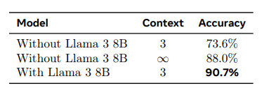 文本规范化。为了快速训练Llama 3嵌入的效果,我们尝试改变模型使用的横向上下文量。我们模型时使用了3个TN令牌(由unicode类别分区)的横向。这个模型与不使用Llama 3嵌入,使用3个令牌的横向或完整连接上下文的模型进行了比较。预期正如,表34,对于不使用Llama 3嵌入的模型,使用完整的横向可以提高性能。然而,结合了Llama 3嵌入的模型超越了所有其他模型,因此能够在不依赖输入中的长下游的情况下,实现令牌速率的输入/流输出式处理。