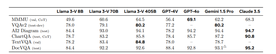 我们在一系列任务中评估了 Llama 3图像理解的表现,这些任务涵盖了自然图像理解、文本理解、图表理解和多模态推理: