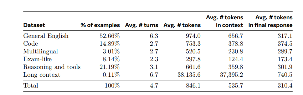 **数据混合总结。**我们的最终数据混合大致包含:50% 通用知识相关的 tokens,25% 数学与推理相关 tokens,17% 代码 tokens,8% 多语言 tokens。