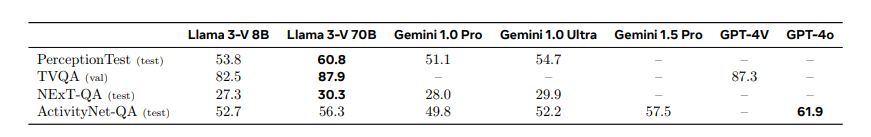 我们在表30中展示了训练中的Llama 3 8B和70B的性能。我们将Llama 3的性能与两个Gemini和两个GPT-4模型进行了比较。请注意,由于我们训练在或高精度数据中没有包含这些基准测试的部分,因此我们所有的任何结果都是零样本的。我们发现,在后面训练期间进行了小型视频加固的Llama 3模型非常有防护性,甚至在某些情况下比其他可能从预训练开始就利用重构多模态处理的模型更好。而我们只评估了8B和70B参数模型,Llama 3在视频识别上表现出色。Llama 3在PerceptionTest上表现最佳,表明该模型具有执行复杂时间推理的能力。在像ActivityNet-QA这样的长篇理解活动任务上,即使模型只处理到64帧,Llama 3也能获得强大的结果,这意味着对于3分钟长的视频,模型每3秒只处理一帧。