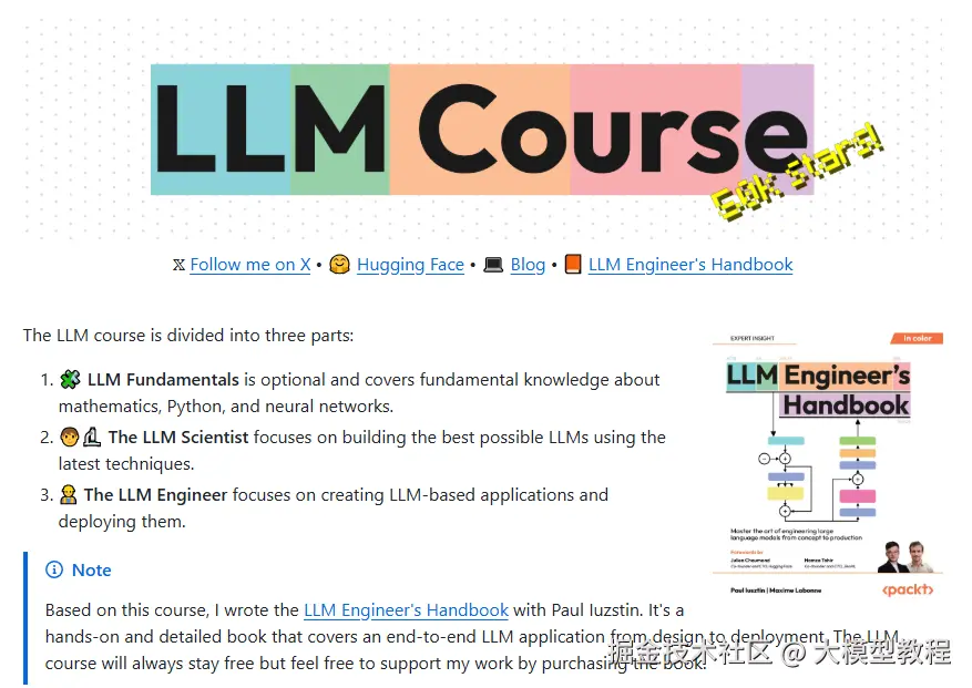 最近在 GitHub 上发现了一个超级硬核的大语言模型(LLM)课程,标星已达到恐怖的67k,它提供了一套完整的学习路线图和可以直接上手的 Colab 笔记,目标就是带你从入门到精通,无论你有没有基础或是想深入研究模型、开发应用,都能找到清晰的路径。