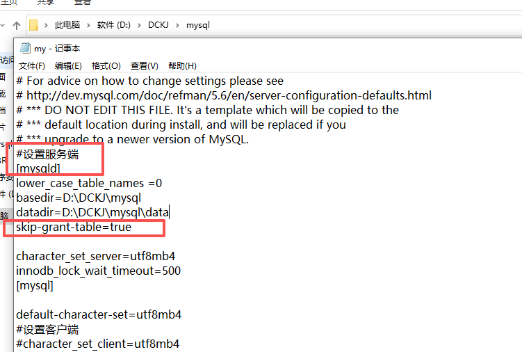在服务端设置部分增加一行,保存并开启mysql服务。