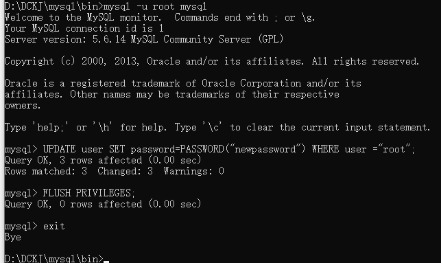 SET PASSWORD FOR 'root'@'localhost' = PASSWORD('newpassword');