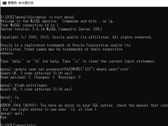 管理员打开命令行用当前用户登入数据库,然后输入以下语句修改密码