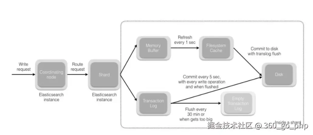 当分片所在的节点接收到来自协调节点的请求后,会将请求写入到Memory Buffer,然后定时(默认是每隔1秒)写入到Filesystem Cache,这个从Momery Buffer到Filesystem Cache的过程就叫做refresh;