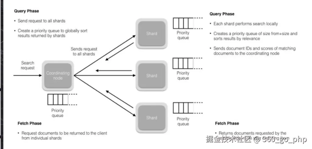 在初始查询阶段时,查询会广播到索引中每一个分片拷贝(主分片或者副本分片)。 每个分片在本地执行搜索并构建一个匹配文档的大小为 from + size 的优先队列。PS:在搜索的时候是会查询Filesystem Cache的,但是有部分数据还在Memory Buffer,所以搜索是近实时的。