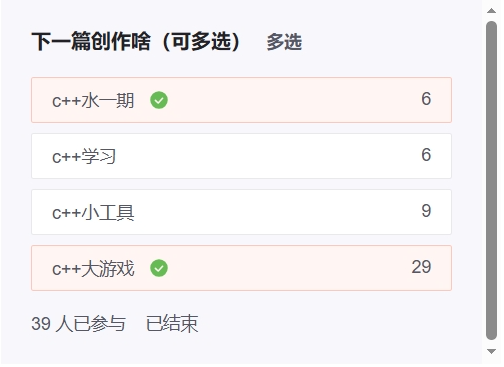 上次投票结果(c++音乐------《两只老虎》)如下: