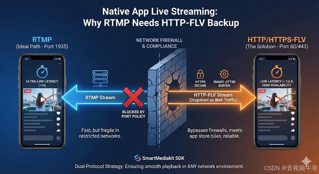 SmartMediakit 在 App 端同时提供 RTMP 与 HTTP/HTTPS-FLV,不是为了叠加协议数量,而是为了构建一套 在各种真实环境中都能稳定落地的高可用(High Availability)传输体系 :