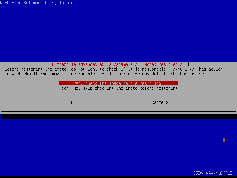 《12》选择【Yes check the image before restoring】(即:恢复之前检查镜像)后按下Enter键,如下图所示: