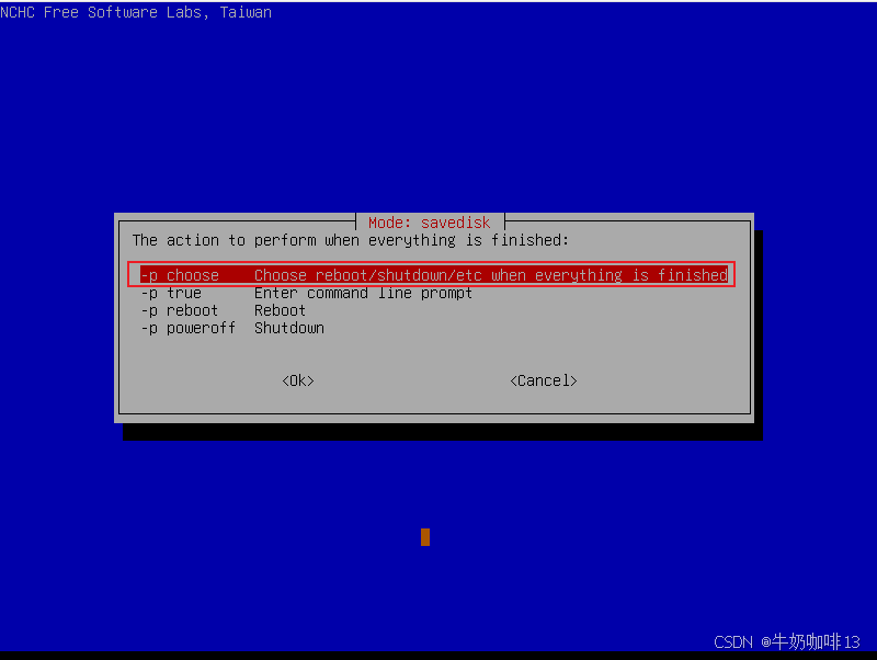 《14》选择【-p choose Choose reboot/shutdown/etc when everything is finished】(即:当所有操作执行完毕,请选择重启/关机/其他操作)后按下Enter键,如下图所示: