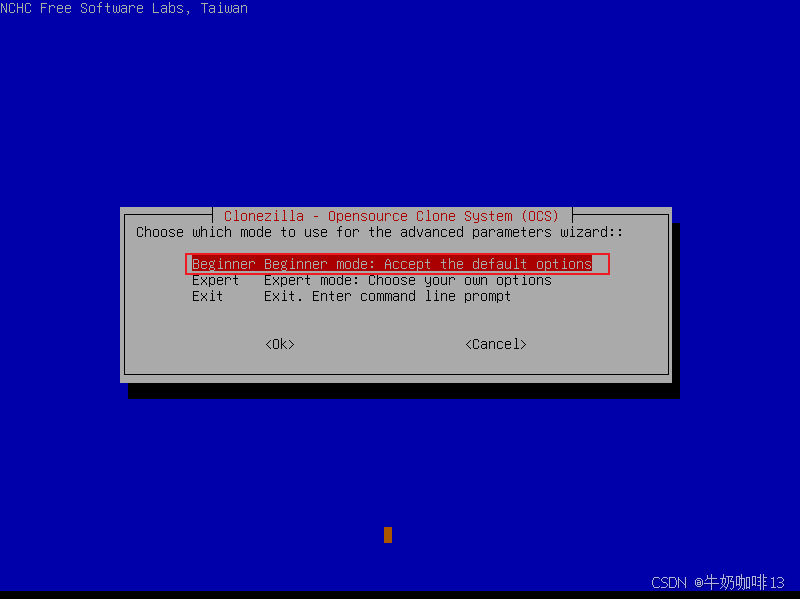 《8》选择【Beginner Beginner mode: Accept the default options】(即:初学模式,接受默认的选择)后按下Enter键,如下图所示: