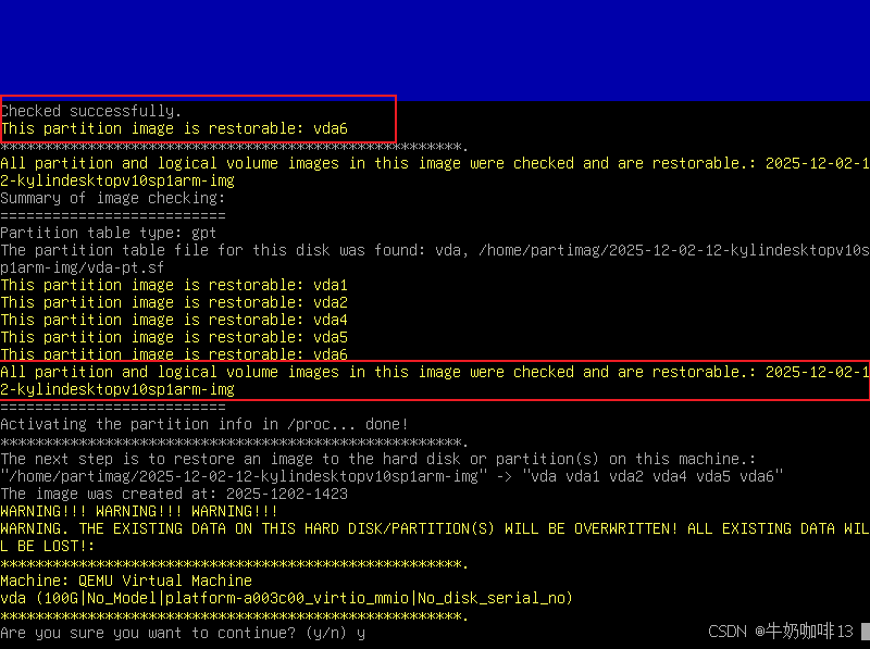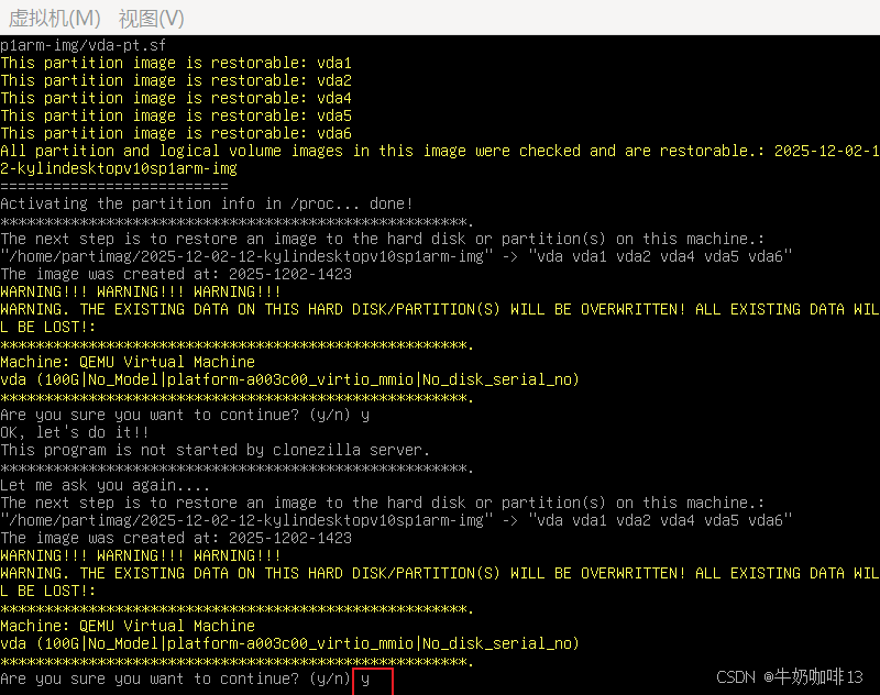 《16》耐心等待系统恢复,中间会出现【两次警告,在这个硬盘/分区的资料将会被完全覆盖掉,所有现存资料将会丢失】都输入y后按下Enter键继续恢复(10分钟左右),如下图所示: