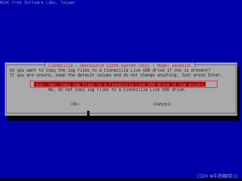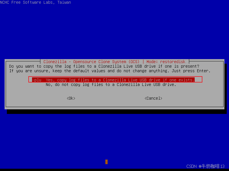 《13》选择【-plu Yes, copy log files to a Clonezilla Live USB drive if one exists.】(如果存在Clonezilla Live USB驱动器,请将日志文件复制到其中)后按下Enter键,如下图所示:
