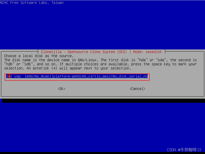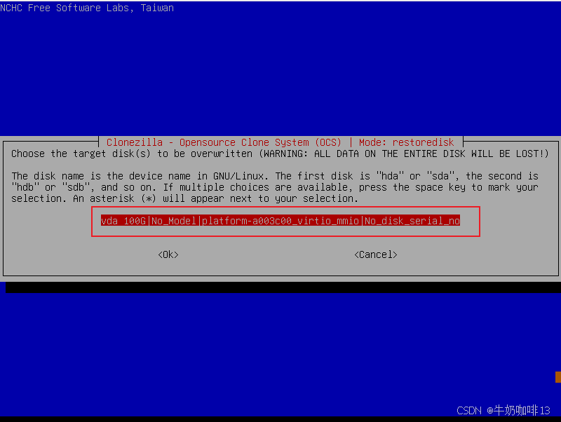 《10》选择需要还原系统的磁盘(如:我这里是vda 100G)后按下Enter键,如下图所示: