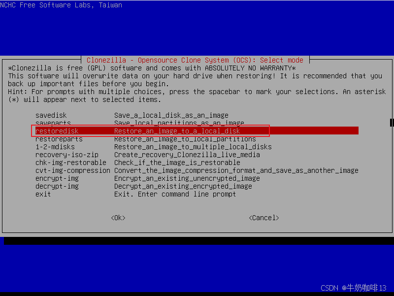 《9》选择【restoredisk Restore_an_image_to_a_local_disk】(即:还原镜像文件到本机硬盘)后按下Enter键,如下图所示: