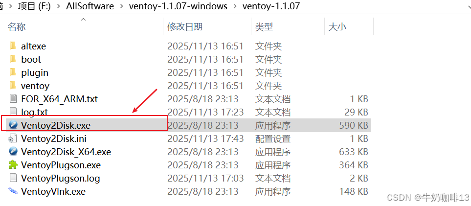 下载好的Ventoy解压后双击【Ventoy2Disk.exe】(或者打开【altexe】目录下的【Ventoy2Disk_X64】或者【Ventoy2Disk_ARM64.exe】)后根据界面提示选择需要制作系统引导的U盘后,点击【安装】即可,如下图所示: