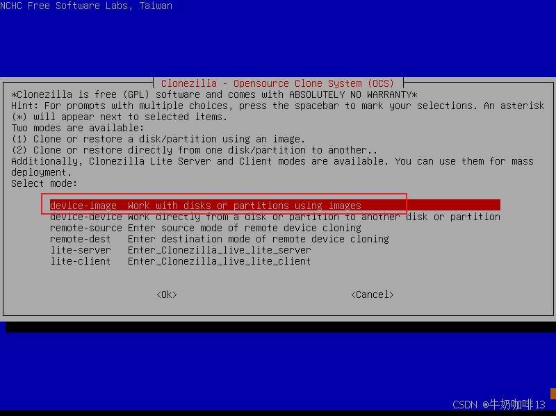 《4》选择【device-image Work with disks or partitions using images】(即:使用硬盘或分区镜像文件)后按下Enter键,如下图所示: