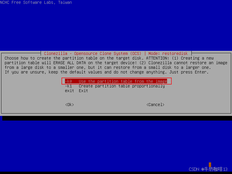 《11》选择【-k0 Use the partition table from the image 】(即:使用镜像分区)后按下Enter键,如下图所示: