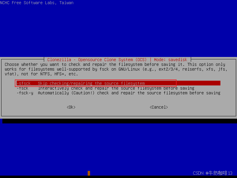 《13》选择【-sfsck Skip checking/repairing the source filesystem】后按下Enter键,如下图所示: