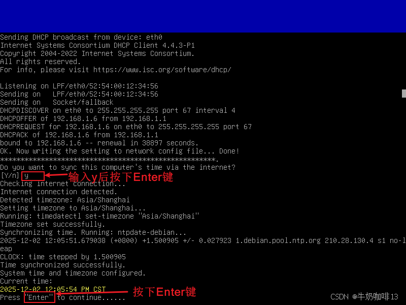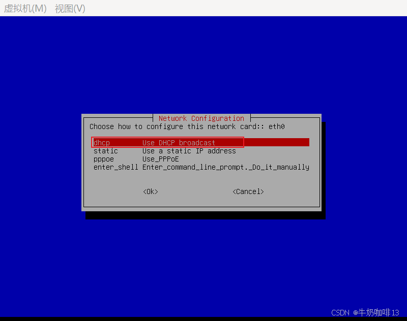 《6》我这里选择【dhcp Use DHCP broadcast】(即使用DHCP自动设置当前系统的IP)后按下Enter键(注意:若你的网络不支持自动DHCP自动获取则需要选择【static Use a static IP address】来自行设置即可),如下图所示: