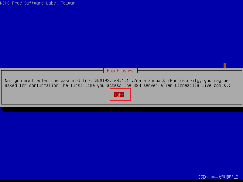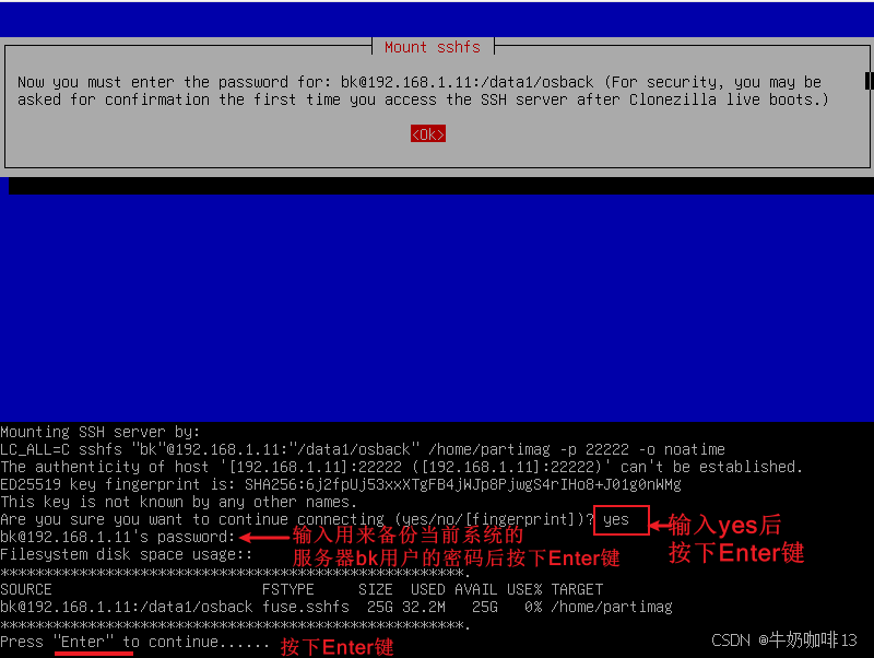 《7》配置通过ssh协议备份到服务器目录的基础信息(即:ssh服务器的IP【如:192.168.1.11】、ssh的端口【如:22222】、ssh服务器上用来备份的账号【如:bk】与ssh服务器上用来备份的目录【如:/data1/osback】)后接着输入用来备份当前系统的服务器bk用户的密码后按下Enter键即可,如下图所示: