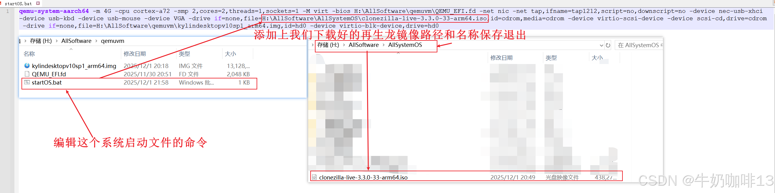 注意:若你是使用x86架构windows通过Qemu模拟的ARM环境,则需要修改安装部署ARM版的系统命令中的file后面添加上下载好的再生龙路径和名称即可,详细操作如下图所示: