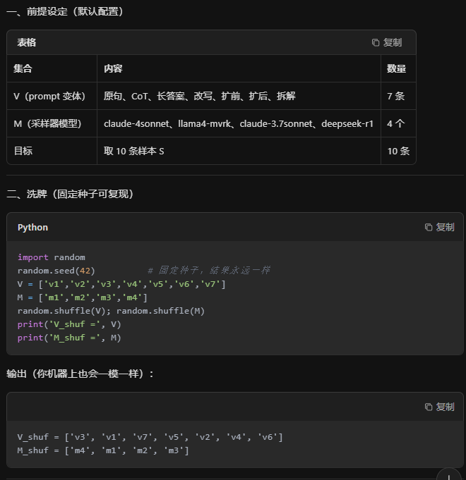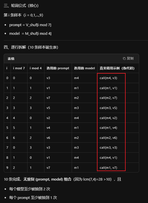 【"轮询顺序"就是:洗牌一次,然后按序号循环拿 prompt 和模型,10 行代码就能跑出永远相同的 10 条样本集 S】