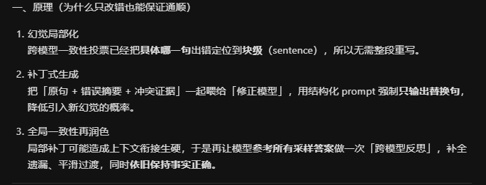 比较这些回答之间的差异,找出不一致的地方,从而识别可能的幻觉。 - 精准修正(Targeted mitigation):